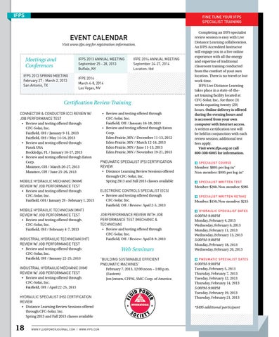 Certification Review Training Connector & Conductor (CC) Review w/ Job Performance Test • Review and testing offered through CFC-Solar, Inc. Fairfield, OH / January 9-11, 2013 Fairfield, OH / May 14-16, 2013 • Review and testing offered through Pirtek USA Rockledge, FL / January 16-17, 2013 • Review and testing offered through Eaton Corp. Maumee, OH / March 26-27, 2013 Maumee, OH / June 25-26, 2013 Mobile Hydraulic Mechanic (MHM) Review w/ Job Performance Test • Review and testing offered through CFC-Solar, Inc. Fairfield, OH / January 29 - February 1, 2013 Mobile Hydraulic Technician (MHT) Review w/ Job Performance Test • Review and testing offered through CFC-Solar, Inc. Fairfield, OH / February 4-7, 2013 Industrial Hydraulic Technician (IHT) Review w/ Job Performance Test • Review and testing offered through CFC-Solar, Inc. Fairfield, OH / January 22-25, 2013 Industrial Hydraulic Mechanic (IHM) Review w/ Job Performance Test • Review and testing offered through CFC-Solar, Inc. Fairfield, OH / April 22-25, 2013 Hydraulic Specialist (HS) Certification Review • Distance Learning Review Sessions offered through CFC-Solar, Inc. Spring 2013 and Fall 2013 classes available