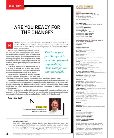 ARE YOU READY FOR THE CHANGE? uh? What do you mean, am I ready for the change? Well, it’s coming in some form or another, whether you are ready or not. You see, it has always been this way and will continue for all time, although today’s change comes at a much-accelerated pace versus yesterday’s rate. What changes am I talking about? Well, for starters, your job—your company closes, your company or department moves off shore, or your way of doing things via your technology changes. Perhaps that long-used pump, valve, or gadget is no longer made or available, etc. This could go on forever, but I need to ask the question again: Are you ready for the change? That is the key issue here, because in the end, it is all going to fall back to YOU being ready, willing, and able to handle what is without question going to happen to each and every one of us: change. As this new year commences, I suggest you make a formal resolution with yourself. This is the year you change. It is your own personal responsibility. Don’t wait for the hammer to fall. A fantastic way to start this process is to get certified. Show the world your skill-set levels, and set yourself apart from the competition. It does make a difference when you go for that next job or that next pay raise. The IFPS can get you certified in many wide and growing classifications. In this issue, you will see what these areas are: pneumatics, hydraulics, technicians, mechanics, and many more. This is a resolution you can keep. These certifications go with you as accomplishments to be recognized by all. Change can and should be your friend because through change you have new opportunities. Embrace it, as all great leaders do. Get certified for 2013 and beyond!