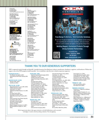 Silver ($500 - $999) Applied Industrial Technologies (2012) Caterpillar, Inc. (2011) HUSCO International (2011) Hydac Technology Corporation (2011, 2012) The Kaas Family (2012) Kraft Fluid Systems (2011) Livingston & Haven, Inc. (2012) Motion Industries, Inc. (2011, 2012) Numatic Engineering (2011) Pacific PowerTech, LLC (2011) Robert & Marie Kraft (2011, 2012) Schroeder Industries (2012) Stauff Corporation (2012) TECO Pneumatic, Inc. (2011, 2012) The Oilgear Company (2012) Valin Corporation (2012) Yates Industries, Inc. (2011) Bronze ($250 - $499) Air Logic (2012) ControlAir, Inc. (2012) Fluid Power Sales Inc. (2011, 2012) The Groot Family Foundation, Inc. (2011) Gulf Controls Company (2012)