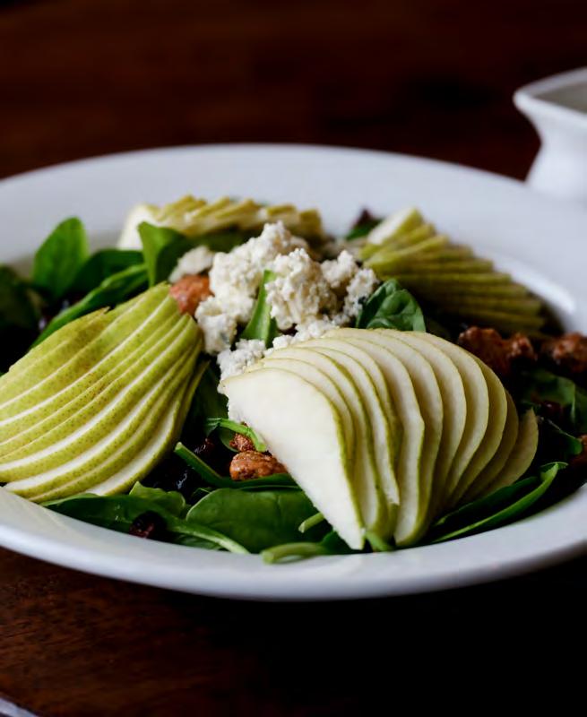 not only can you easily tell it’s made from scratch, you can also tell it’s made with great care. Uniformly thin slices of fresh pear are fanned atop a bed of the freshest spinach with Stilton cheese crumbled in the center. Toffee pecans and sun-dried cranberries, scattered over the greens, add sweet texture. Enhanced by white honey balsamic dressing, this stunner of a salad is proof that food that’s good for you can be delicious, too.