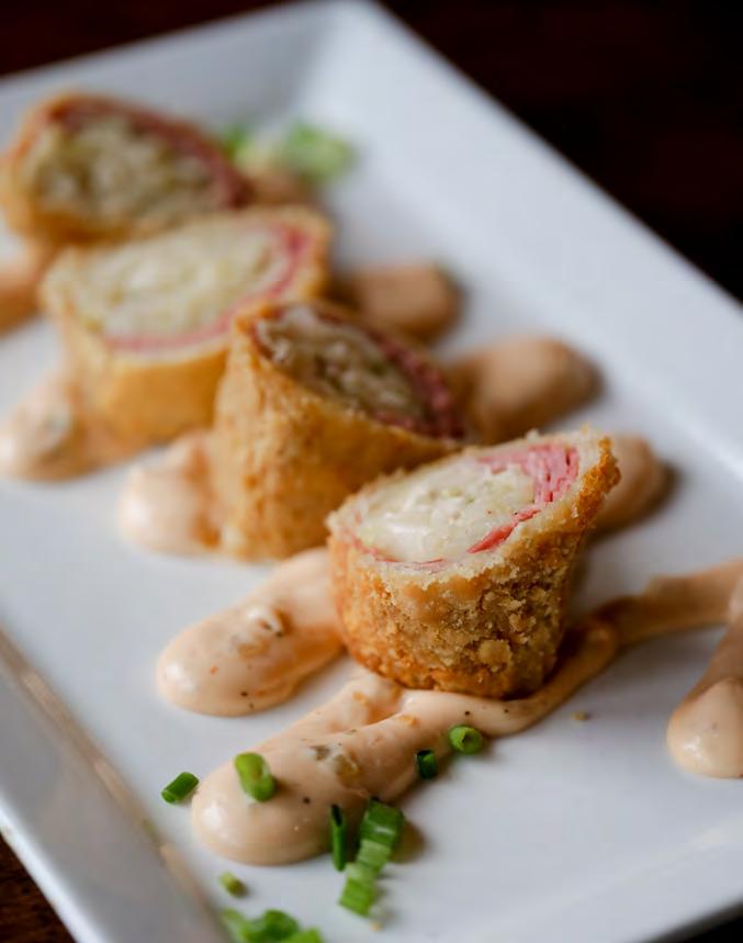 The Corned Beef & Cabbage Spring Roll appetizer could easily be described as St. Patrick’s Day in a bite. A deep-fried egg roll wrapper features cabbage stuffed in the center with corned beef wrapped around the perimeter. Served just warm enough, on a bed of 1000 Island rémoulade, the roll’s tender, savory interior gets balance from the crisped wrapper. Yum.