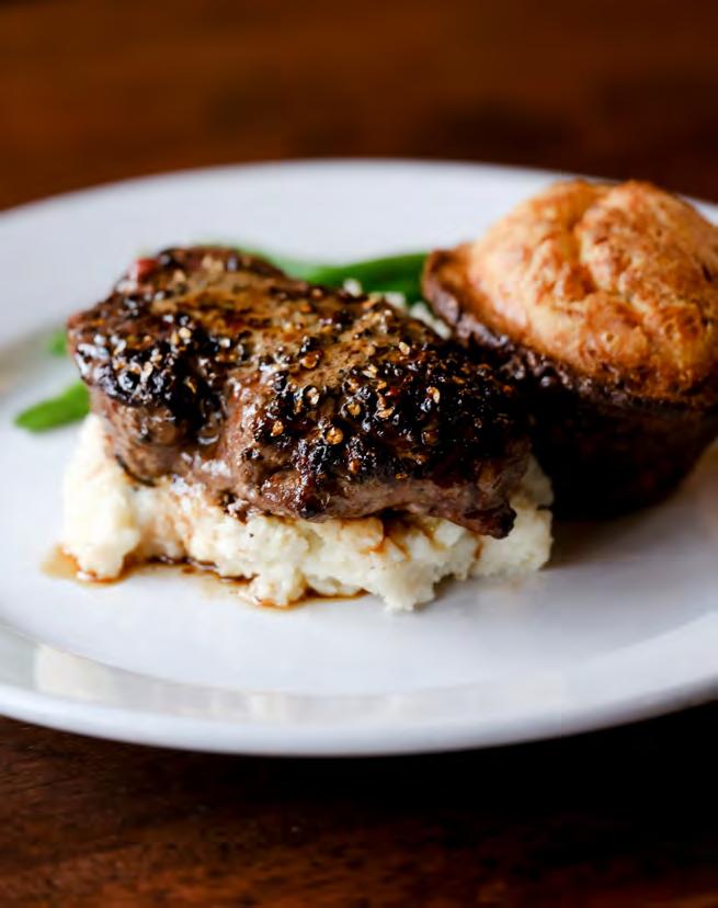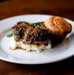 Seared Pub Steak features peppercorn iron-seared top sirloin with classic CheddarBacon Yorkshire Pudding and Worcestershire Compound Butter. The pointed peppery flavor notes accent the savory steak, tempered by the dense pudding with its cheesy, smoky counterpoint and the tangy, complex flavor of Worcestershire sauce added via the richness of butter. Oh my. Mashed potatoes and intelligently cooked, al dente green beans finish this plate that’s a hearty, oh-sosatisfying meal.