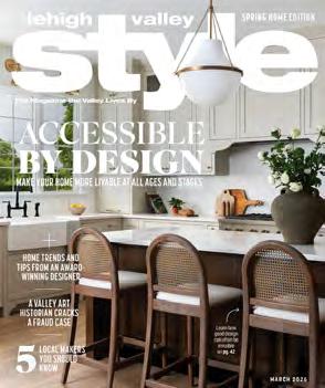 Oaklander, who worked with the FBI to take down a fraudster—that story is on pg. 33. But this edition isn’t just about art; we also shine a light on intentional design choices and how they can improve the function of your home. Scott and Jessica Holwick of Restart Renovation and Design talk to us on pg. 42 about accessible design and how your home can grow with you through each stage of life while still looking beautiful, not clinical. Plus, don’t miss a conversation about nervous system regulation with Nicole Chetcuti on pg. 29, a hearty meal out at Braveheart Highland Pub on pg. 60, a sip of spring on pg. 64 and more in this month’s edition of Lehigh Valley Style