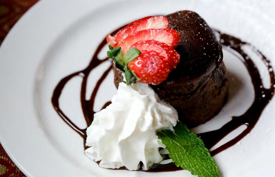 Chocolate Lava Cake is a fine comfort food finale. Break open the individual cake and watch the warm, gooey, deep dark center flow onto the plate, then drench each bite in that sauce on the way to your mouth. Whipped cream adds dreamy, creamy lightness to the decadence; a sliced strawberry garnish ensures a modicum of antioxidant nutrition along with lots of carbohydrates. All gustatory satisfaction should be so pleasurable.