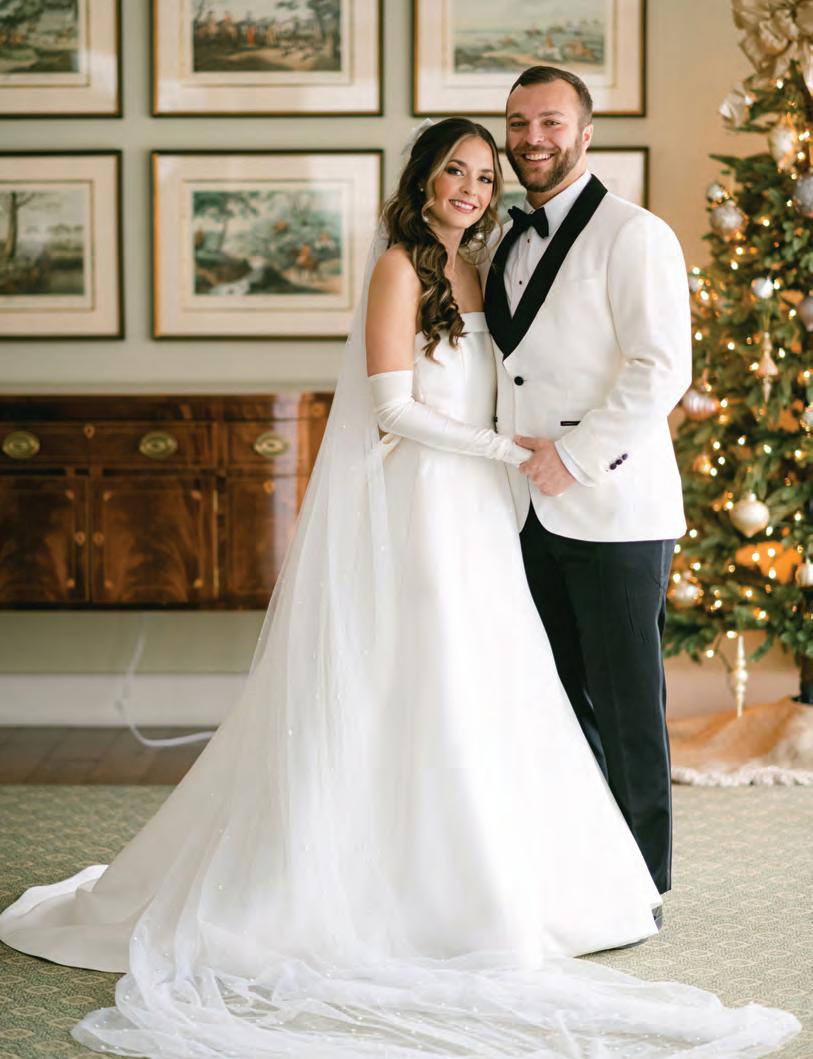 They held their wedding on a chilly, rainy day, warming family and friends with the glow of candlelight, Christmas trees and trays of holiday cookies. Having lost her father, Chelsea was walked down the aisle by Zach’s father and stepfather, and the couple recreated his grandparents’ wedding photo to display at home beside the original. Their 30-person head table included all their closest people, and a cute vintage telephone recorded personal messages as an audible guest book. As the couple glided into their first dance, the scene was captured by a live painter, creating yet another heirloom treasure from an unforgettable event full of sentiment and style.