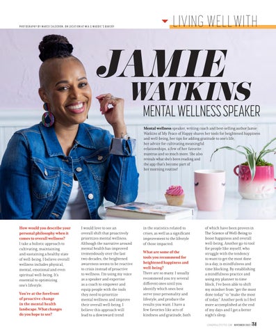 MENTAL WELLNESS SPEAKER Mental wellness speaker, writing coach and best-selling author Jamie Watkins of My Peace of Happy shares her tools for heightened happiness and well-being, her tips for adding gratitude to one’s life, her advice for cultivating meaningful relationships, a few of her favorite mantras and so much more. She also reveals what she’s been reading and the app that’s become part of her morning routine!
