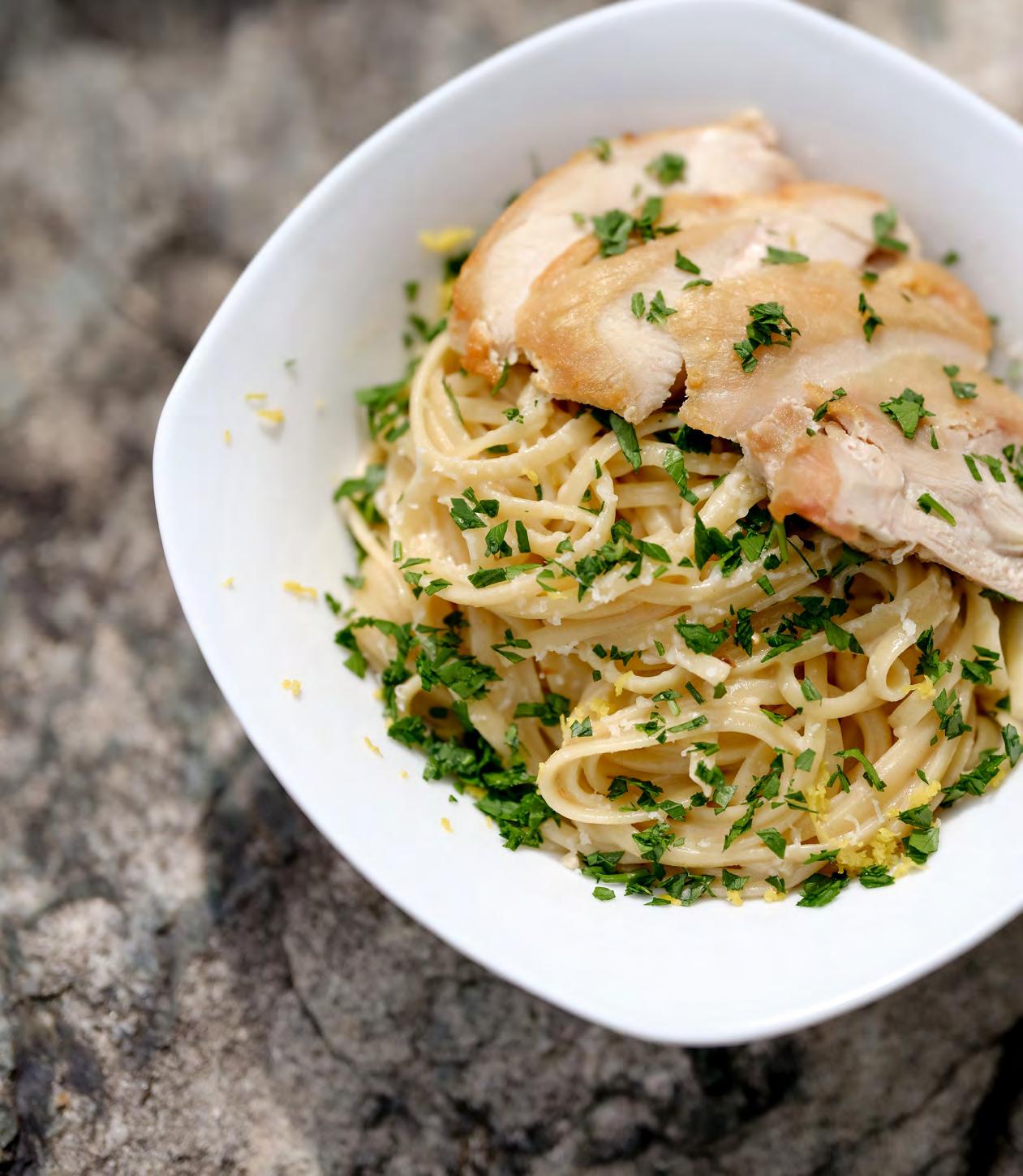 Finish with fresh grated Parmesan cheese, lemon zest and ½ bunch chopped parsley once sauce adheres to pasta.