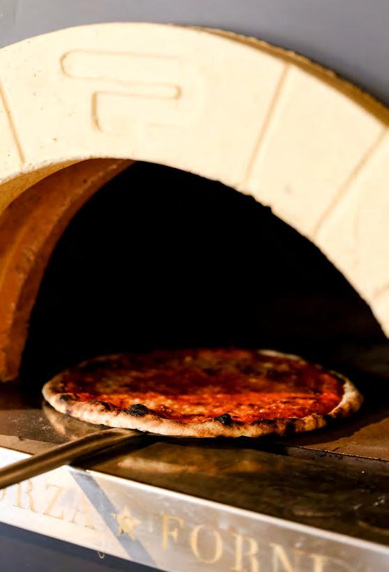 Pucciariello and Devlin spent a lot of time developing the pizza crust, finally discovering the sweet spot for fermenting the dough at 48–72 hours. After much research, Devlin settled on the Italian Pavesi hearth from Modena, Italy, that sits at the restaurant’s center.