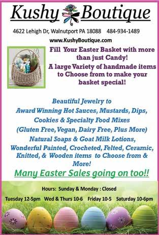 FREE VOLUME 37, NO. 13 APRIL 6, 2023 DISTRIBUTING 11,000 COPIES TO LEHIGH, CARBON, AND NORTHAMPTON COUNTIES SINCE 1985 askus@townandcountrygazette.com • 610-767-9600 NEXT ISSUE: APRIL 20 • DEADLINE: WEDNESDAY, APRIL 12 Happy Easter