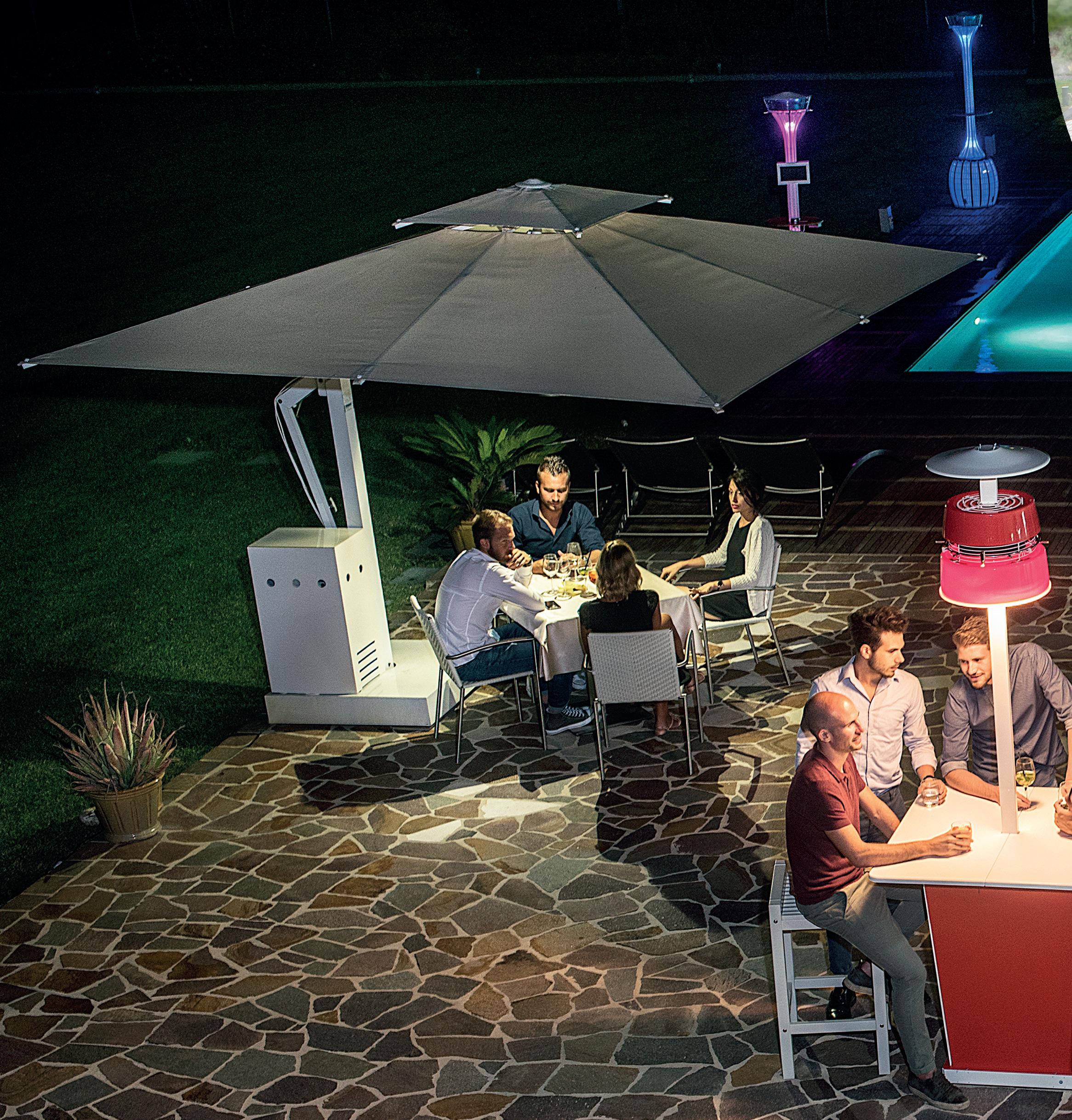An electric resistance that heats when the temperatures are low, so as to be able to spend in comfort the moment of drink outside. When it is too hot a misting system refreshes people and neutralizes odour.