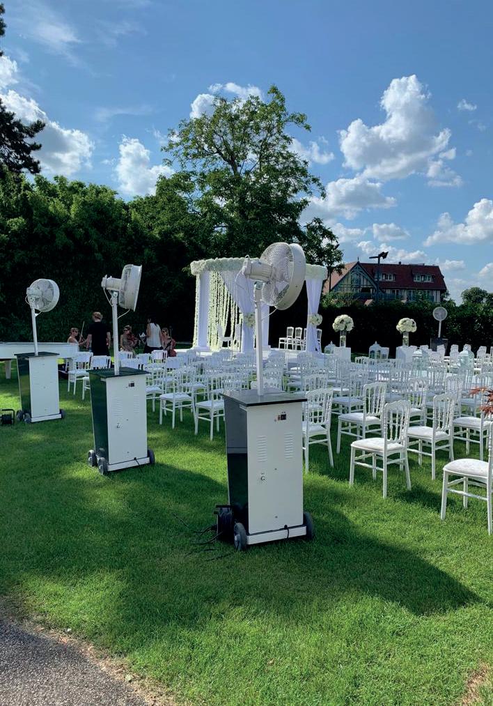 The millions of pressurized water droplets produced are thinner than a single hair. The sprayed water vaporizes before touching the ground without wetting people or objects and lowering considerably the surrounding temperature. To work optimally, we recommend using Enjoy products in poorly ventilated areas.