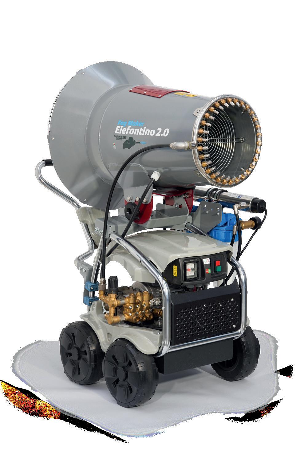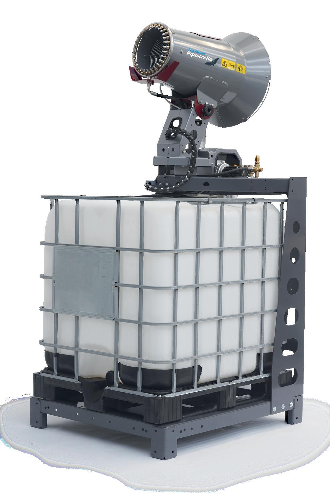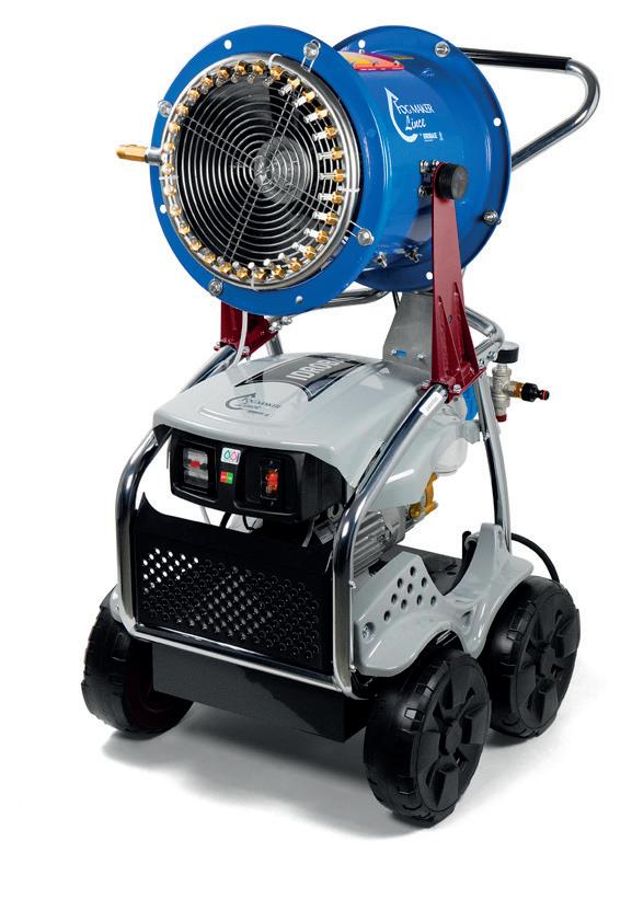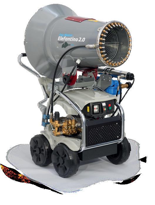 Mobile high pressure fog maker complete with fan and ring of nozzles, 60bar 1 and 4l/min pump module, 30L tank (Lince 1), ON-OFF electric panel. Fan jet: 7m.