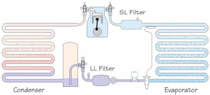 Prima di entrare nella valvola termostatica però, la molecola attraverserà il ricevitore del liquido e successivamente il filtro deidratatore. Questi passaggi si rendono indispensabili per evitare di far arrivare alla valvola di espansione termostatica eventuali particelle gassose, non condensate, ed eventuali molecole di H2O presenti nel circuito sotto forma di umidità. Sappiamo bene quanto entrambe queste due cose non vadano d’accordo con un espansione di tipo “flash”: sia le