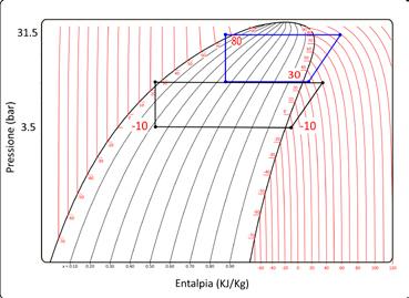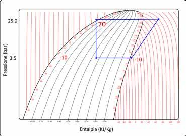 Sempre leggendo il diagramma entalpico, si nota che per ottenere 70°C di temperatura in condensazione, la pressione nel sistema raggiunge valori di circa 25 bar, con rapporti di compressione piuttosto elevati, ma comunque raggiungibili dai normali compressori. Il rapporto di compressione di fatto è un secondo limite fisico imposto questa volta dai compressori. Volendo spingere oltre si andrebbe ad incrementare questo rapporto di compressione che, a fronte di un maggior consumo di energia elettrica, riuscirebbe comunque a fornire temperature di lavoro prossime agli 80°C.