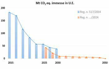 Sembra ormai arrivata alla fine la lunga discussione sul nuovo Regolamento europeo sui gas fluorurati ad effetto serra. Nell’ultimo numero di Hydra avevamo già avuto modo di dare alcune anticipazione sull’argomento, nello specifico avevamo anticipato gli obiettivi che a nostro avviso erano ormai ben chiari: primo fra tutti l’eliminazione dei gas fluorurati entro il 2050. Adesso, con l’approvazione in sede di Parlamento europeo del Regolamento, siamo arrivati alla conclusione dell’iter, che si concluderà più propriamente con la pubblicazione in Gazzetta ufficiale dell’Unione Europea. Il nuovo Regolamento entrerà poi in vigore il ventesimo giorno successivo alla data di pubblicazione. A breve cominceremo a parlare quindi di: Regolamento fgas (UE) n. .../2024 e non più di regolamento fgas (UE) n. 517/2014. Avremo modo di approfondire nei prossimi mesi il regolamento, anche a fronte della sua pubblicazione in Gazzetta Ufficiale, intanto però ci sentiamo di fornire alcune importanti anticipazioni. Il documento recentemente votato stabilisce disposizioni in materia di contenimento, uso, recupero, riciclaggio, rigenerazione e distruzione dei gas fluorurati a effetto serra e le misure accessorie connesse, quali la certificazione e la formazione, che comprende, l’uso sicuro di gas fluorurati a effetto serra e di sostanze alternative che non sono fluorurate. I gas fluorurati a effetto serra sono sostanze chimiche di origine antropica e sono potenti gas ad effetto serra, spesso diverse migliaia di volte più potenti dell’anidride carbonica (CO2). Insieme alla CO2, al metano e all’ossido di azoto, i gas fluorurati a effetto serra appartengono al gruppo di emissioni di gas a effetto serra oggetto dell’accordo di Parigi. Oggi le emissioni di gas fluorurati a effetto serra nell’Unione rappresentano il 2,5 % delle emissioni totali di gas a effetto serra e sono raddoppiate tra il 1990 e il 2014, contrariamente alle altre emissioni di gas a effetto serra che sono diminuite. Cambiano gli obiettivi, che si fanno più ambiziosi, anche a fronte del documento Green Deal europeo, con il quale la Commissione europea si è data la volontà di rendere l’Europa il primo continente climaticamente neutro e a inquinamento zero entro il 2050. Ed è appunto il 2050 l’anno in cui il nuovo Regolamento mira ad azzerare il quantitativo massimo di idrofluorocarburi che possono essere immessi sul mercato dell’Unione, sempre con riferimento alle emissioni di tonnellate di CO2 equivalenti. Viene rivisto quindi il famoso phase-down che adesso diventa un vero e proprio phase-out con appunto il 2050 come termine ultimo per l’immissione sul mercato di nuovi prodotti contenenti HFC, si veda il confronto tra i due Regolamenti riportato nel grafico seguente: