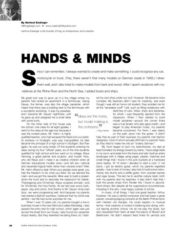 ed my own shop under our roof. However, life became more My great luck was to grow up in a tiny village where my complex: My teachers didn’t care for creativity, and even parents had rented an apartment in a farmhouse. Georg though I was still an honor roll student, they scolded me for Gauss, the farmer, was also the village carpenter, which all the “senseless stuff” I did, such as filling notebooks with meant that there was a building next to the farmhouse with sketches of cars, bikes, ships and airplanes, a wonderful workshop. It was my paradise, for which I was frequently ejected from the and I became Mr. Gauss’ nightmare, until Ideas are the notes, classroom. When I then started to build he gave up and assigned me a small table with some tools. but model making is model airplanes—around the corner there was a true fanatic who also gave credit—and On the other side of the house was began to play American music, my parents the school: one class for all eight grades. I the orchestra. became concerned. For them, I was clearly went to the class at the age four because it —frog mantra on the path down into the gutter. It didn’t was the coolest place. Mr. Hahn—a highly help that as part of their business my parents met fashion qualified teacher, who had escaped the Nazis into our pietisdesigners, most of whom actually affirmed my parents’ fears tic enclave—in hindsight, was way overqualified; he later as they tried to make me into an “orderly German.” became the principal of a high school in Stuttgart. But then My mom began to burn my sketchbooks; my dad at again, he was our lucky break: Of the students entering his least funneled my energy toward toy trains. I had a large table class during my four “official” years, six of the nine students in my room, and aside from the trains and rails I built an entire qualified for high school and two went on to college: Klaus landscape with a village using paper, plaster, matches and Henning, a great painter and sculptor, and myself. Now, small things that I found in the junk buckets at a hardware why did Klaus and I make it as creative children when all store nearby. At 14 when I decided to start a rock ’n’ roll German educational models were—and still are—rational band, I got an electric guitar, which my parents regretted and rewarded logical traits rather than visceral ones? Well, greatly—due to lack of money I also had to build some instruMr. Hahn offered a deal: When your grades were great, you ments, like drums and a skiffle guitar, from wooden barrels had the freedom to do what you liked. So we learned like and cigar boxes. This led me to another culture clash, both mad—and we got the rewards. Mine was to build a scaledwith my parents and my teachers. It also didn’t help that I down fire truck and to decorate the classroom for Easter, built the power amps from Fender kits I found in secondThanksgiving and Christmas. Klaus sculpted animals—and hand shops. But despite all the suppressive circumstances, for Christmas, the Holy Family. All we had was wood, bark, including in the arts, I was happy outside of school. paper, clay and colors. And thanks to Mr. Gauss’ shop next In music, of all things, I had one great teacher: Arthur door, we were progressing well. And because my parents Kusterer. He was a retired composer and had been a great had started a fashion business, I believed that my world was pianist, including playing concerts at the Berlin Philharmonic perfect—but life had some surprises for me. with Herbert von Karajan. He could explain—in musical When I was 10 years old, my parents bought a live-in terms—that creativity is rooted in believing and doing, withbusiness house in the next little town called Altensteig. I also out leaving another choice. He let me play the blues, but passed the entry test for high school, which again was just also requested that I learn at least the basics of Mozart and across the street from our house. I also found two carpenter Beethoven. He didn’t respect fixed times for periods and shops nearby. But they resented me being there, so I start-
