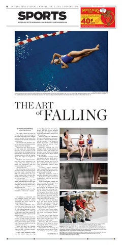 a diver flipping from the springboard. The pair of eyes tattooed on his right calf tell the divers that even when his back is turned, he’s still watching. Now 44 years old, Johansen’s life has revolved around this sport. As a diver at Arizona State University, his mentors — the people he looked up to most — were diving coaches. Even his wife is a twotime Olympic diver. Johansen coached the U.S. Olympic Team to four medals in London in 2012. If he retains the position come 2016, he’s hoping at least one of his IU divers will be there with him. He molds his coaching around the psyches of each of his divers. On the tower, divers surrender apprehension, placing their trust in the coach who put them up there. Their relationship builds a little each day. “It takes a while,” Johansen says, “especially when you’re telling these kids to do things that are quite literally terrifying.” Otherwise, hesitation leads to mistakes. Mistakes lead to injuries. It’s hard not to feel intimidated looking down from the top of the 10-meter tower. When descending toward the water at about 30 miles per hour, perfect execution is crucial. A faulty takeoff from the diving tower can be dangerous, even deadly. Thirty-one years ago, during the World University Games, a 21-year-old Soviet diver hit his head after he failed to clear enough space between his body and the tower. He slipped into a week-long coma and died of his injuries. Five years later, an Australian diver was killed during practice when he, too, failed to clear the tower during takeoff — smashing his head on the platform, then crashing into the water below. All divers, says Coach Johansen, face fear every time they climb the tower. Even Olympic champions. “It’s how they use that fear that determines whether they can perform or not,” says the coach. “It’s a constant part of this sport.” Fear isn’t the only constant. Habit and ritual keep the divers disciplined, which creates consistency. The athletes adapt. Throughout their training, the tower divers practice the art of illusion. While in competition, judges SEE DIVE, PAGE 10