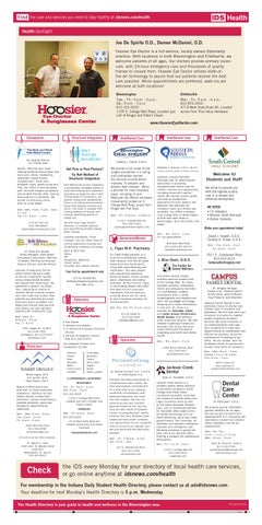 For membership in the Indiana Daily Student Health Directory, please contact us at ads@idsnews.com. Your deadline for next Monday’s Health Directory is 5 p.m. Wednesday. The Health Directory is your guide to health and wellness in the Bloomington area.