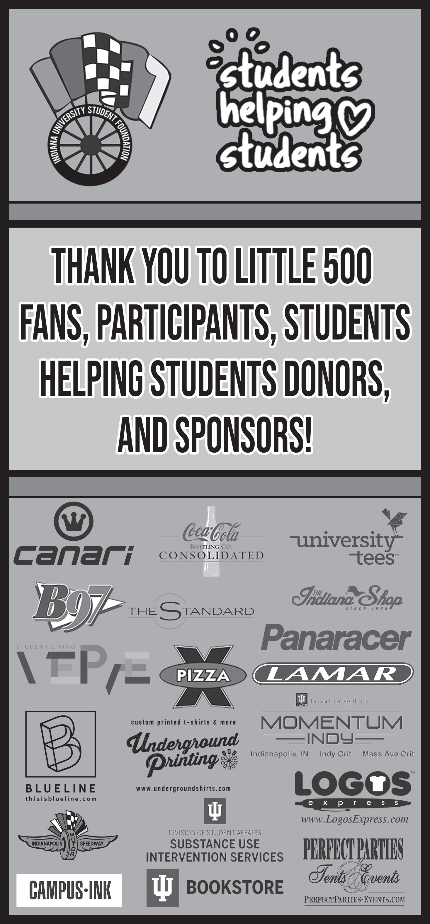Row 1 Row 2 Row 4 Row 6 Row 8 Row 9 Row 10 Row 11 Row 3 Row 5 Row 7 Cutters Alpha Kappa Psi Alpha Sigma Phi Ghost Cycling 3PH Cycling Forest Cycling Tau Epsilon Phi Wild Aces Cycling Chi Phi Alpha Kappa Lambda CSF Cycling Sigma Phi Epsilon Phi Kappa Psi Delta Tau Delta Phi Sigma Kappa Delta Sigma Pi Phi Delta Theta IUDM Cycling Army Cycling Cinzano Chi Alpha Beta Sigma Psi Sigma Alpha Epsilon Phi Gamma Delta Pi Kappa Alpha Novus Lambda Chi Alpha Evans Scholars Bears Beta Theta Pi Human Wheels Gray Goat Sigma Nu Torin Kray-Mawhorr Peyton Gaskill Jacob Koone Judah Thompson Luke Naas Lucas Lemme Rhett Skvarna Bayden Lutz John Gudeman Max Raynor Jake Herendeen Will Beresheim Owen Teed Collin Monesmith Alexander Macharaschwili Josh Evans Jacob Haggarty Owen Longest Shaun Seguin Jack Wagner Sam Hixson Michael Sears Ryan Costabile Colten Seiler Thomas Domian Garett Walker Eric Lewis Kobe Thompson Quinn Panucci Camden Saylor Jeff Raley Stuart Reimers Brooks Hillenbrand Austin Richards Jackson Klem Kyle Rosecrans Jacob Fierce Wyatt Holtan Teja Basireddy Keshav Laddha Paul Smith Andrew Flynn Michael Dubois Ben McKeown Kyle Preston Dan Lin Steven Song Josh Gritt Josh Topor Clay Keiser Josh Church Brian More Spencer Perin Ryan Kerrigan Lucas Everhart Andy Argue Jonathan Frazier Spencer Puett Sean Grim Ryan Lo Luke Breier Clayton Blazek Anthony Siener Jonathon Ralston Conor Berry Garrett Cortesi Greyson Welsh Carson Heath Jon Petersen Brady Jarosinski Josh Herbst Blake Kottlowski Ethan Barrows Mauricio Brito Gavin Gorski Michael Cashman Aidan King Quinn Fellin Andrés Borrego Hunter Eissler Tommy Frankiewicz John Bulgarelli Peter Schultz Dylan Bushelle Carson Etnyre Kaleb Cooper Albert Schafer Hunter Jones Ben Baines Paul Lee Rishi Poludasu Max Rezek-Tewinkle Ezekiel Robertson Bennet Gassner Ben Vorisek Raffaele Zallo Elias Konow Thomas Reising Quinn Peterson Drew Miller Kyle Gabbard Tommy McQueeny Jack Law Mike Lupke Billy Gregory Graham Hampton Dhruv Purohit Sam Bedich Scott Behman Joe Staszkow Tokelo Makepe Brennan Skirzenski Charlie Jacoba Brady Fischer Joshua Brinkman Lukas Troutman Matthew Van Kley Zane Gruwell Nathan Soto Taylor Gasman Isaiah Jones Shawn Kinslow Austin Slattery Jeremy Rosenblum Stephen Franke Micah Plofsky Moshe Zaremba Will Pitts Alex Hamilton Max Martin Drew Gavette Download the mobile app to request a ride. and rides for students within Bloomington city limits! FREE SAFE STUDENT OPERATED & UNIVERSITY FUNDED iuride.indiana.edu 1713 N. College Avenue, Suite #3 Bloomington, IN 47408 hours Monday - Thursday.......11 a.m. - 10 p.m. Friday - Saturday...........11 a.m. - 10 p.m. Sunday...................................CLosed $5 LARGE BREAD STICKS Mention this ad to redeem 812 822 3190