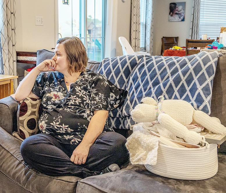 Danielle sits in her home next to her basket for Charlotte. When Indiana government officials met to discuss the future of abortion in Indiana, Danielle told them about her daughter.