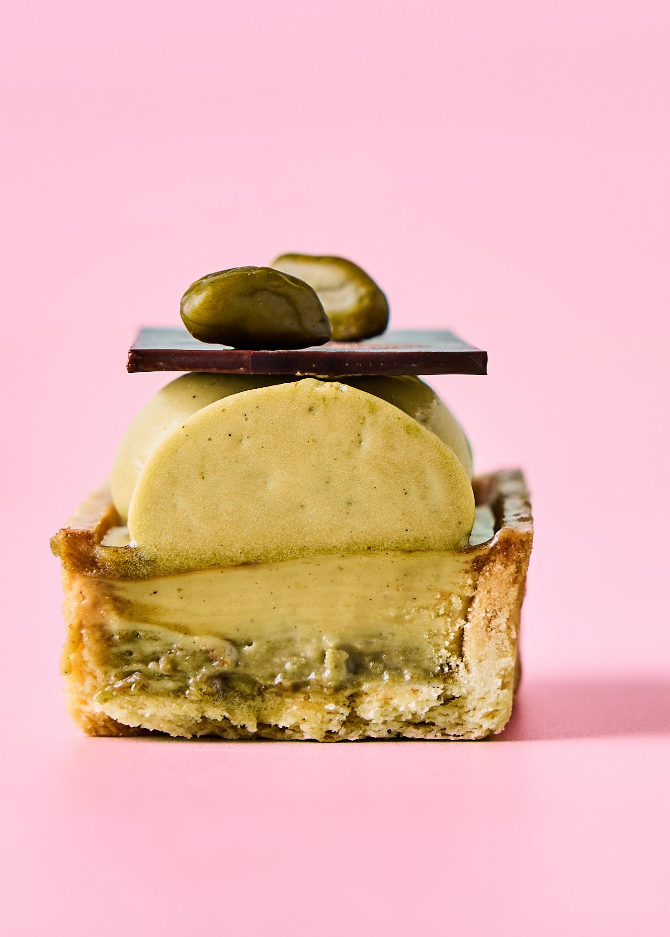 Terte fylt med mazarinmasse, toppet med Idun Suksesskrem, hakkede pistasjnøtter og Decorta høvlet sjokolade.