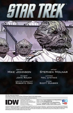 STAR TREK #14. OCTOBER 2012. FIRST PRINTING. ® & © 2012 CBS Studios Inc. STAR TREK and related marks are trademarks of CBS Studios Inc. © 2012 Paramount Pictures Corporation. All Rights Reserved. IDW Publishing authorized user. © 2012 Idea and Design Works, LLC. All Rights Reserved. IDW Publishing, a division of Idea and Design Works, LLC. Editorial offices: 5080 Santa Fe Street, San Diego, CA 92109. Any similarities to persons living or dead are purely coincidental. With the exception of artwork used for review purposes, none of the contents of this publication may be reprinted without the permission of Idea and Design Works, LLC. Printed in USA. IDW Publishing does not read or accept unsolicited submissions of ideas, stories, or artwork.