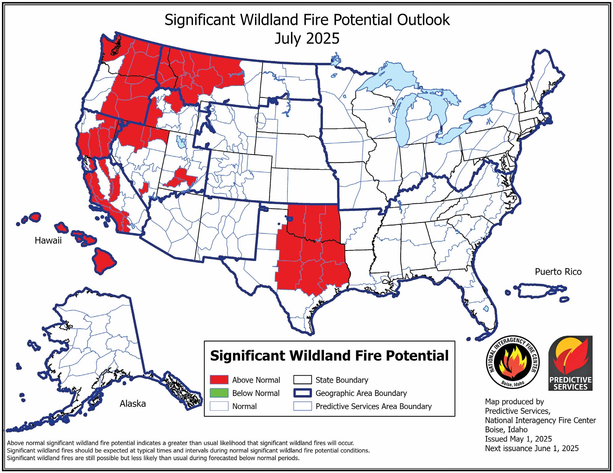 “The marine layer is likely to decrease its influence during July and August which would allow for grassy areas closer to the coast to cure. Increased drying across the mountain [Predictive Service Areas] will result in drying of the timber fuel types, as well. These factors contribute to above normal significant fire potential,” said the South Ops May Outlook