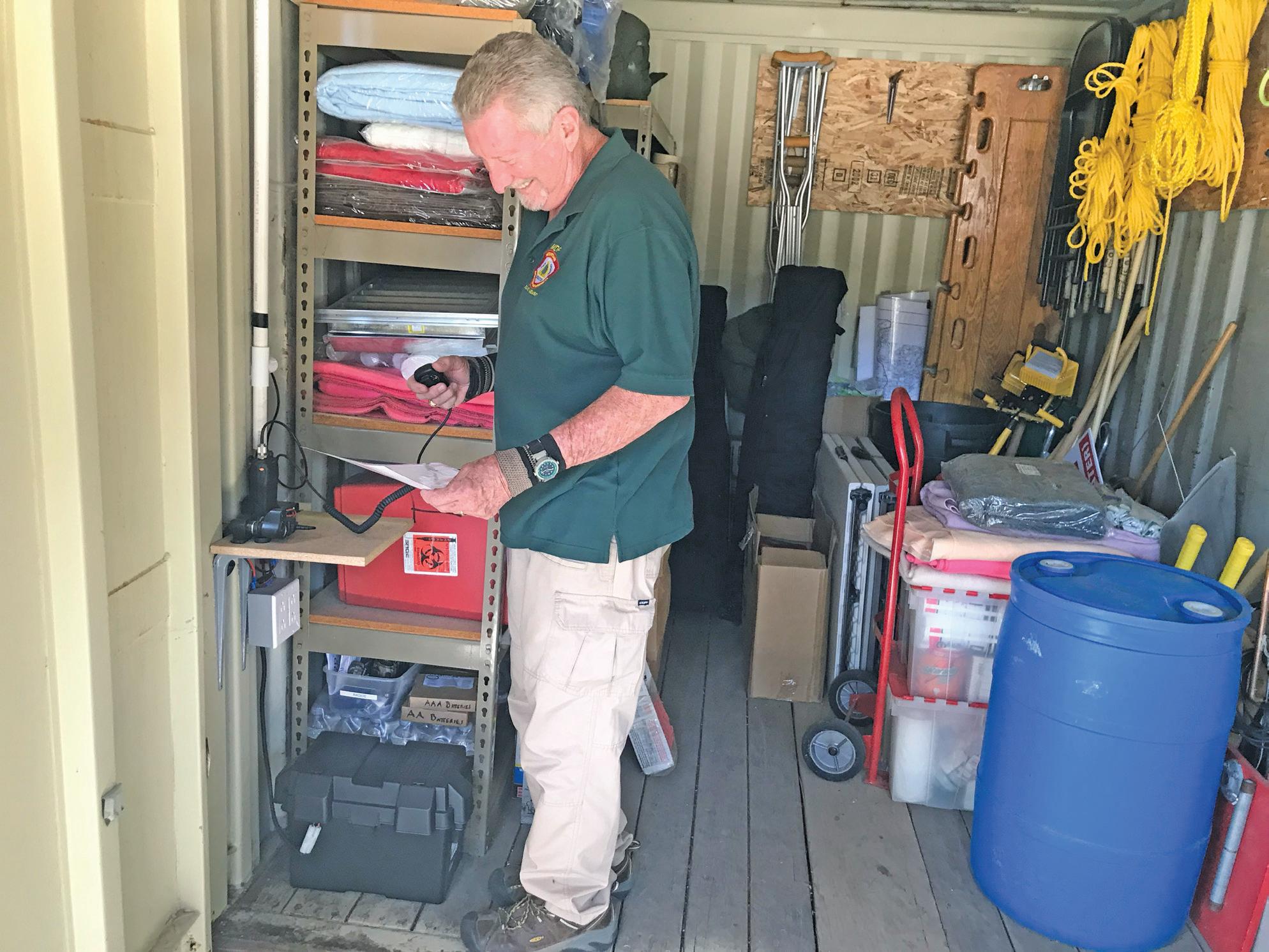 Hewitt opened one of MDP’s Disaster Aid Stations to show the contents: emergency supplies including first aid materials, radios, search and rescue equipment and lighting and power units. The Pine Cove station is the first to use a solar power system with deep cycle