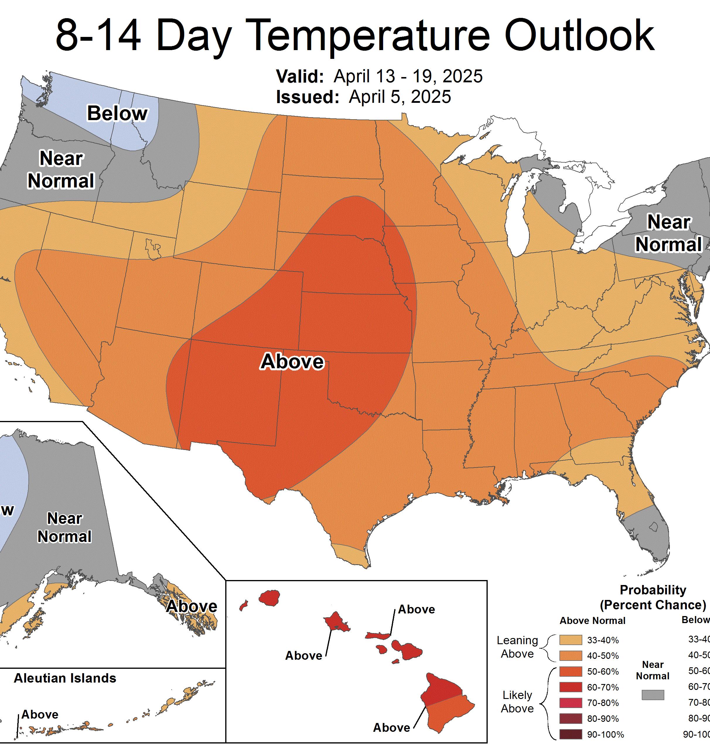 On April 4, Tardy forecast a very warm April, with the chance of a couple of heat waves. Possibly, 10-15 degrees higher than normal, he said, with heat risks possible at lower elevations. The desert cities could be 100 degrees.