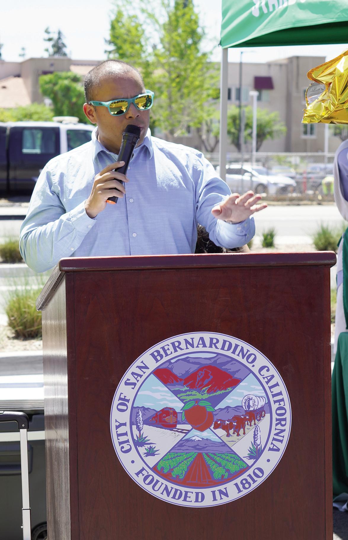 PHOTO MANNY SANDOVAL San Bernardino Ward 1 Councilman Theodore Sanchez addressing the crowd at the 5th Street Gateway ribbon cutting in April 2024, ahead of the recall efforts.