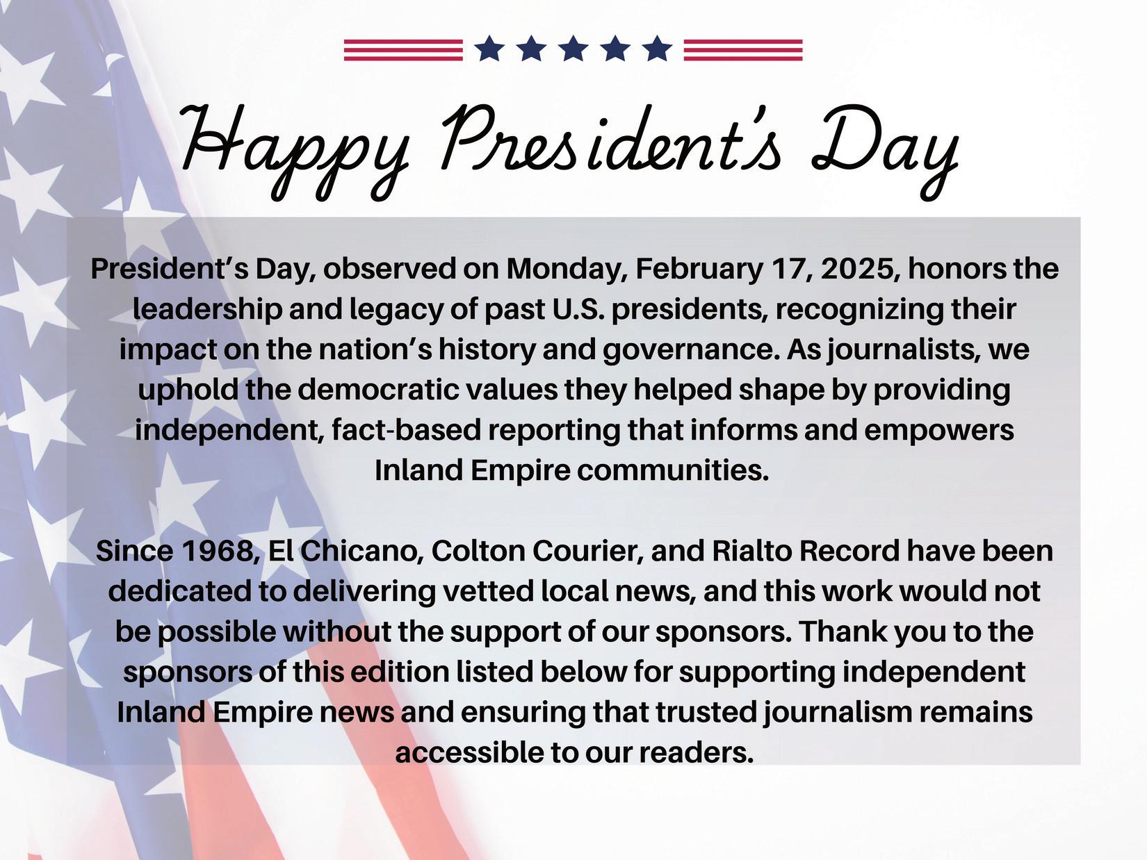 Thank you sponsoring IECN’s President’s Day edition in El Chicano, Colton Courier, and Rialto Record. Your support helps us continue delivering meaningful news to our communities! Rialto Record. Your support helps us continue delivering meaningful news to our communities! Rialto Record. Your support helps us continue delivering meaningful news to our communities!