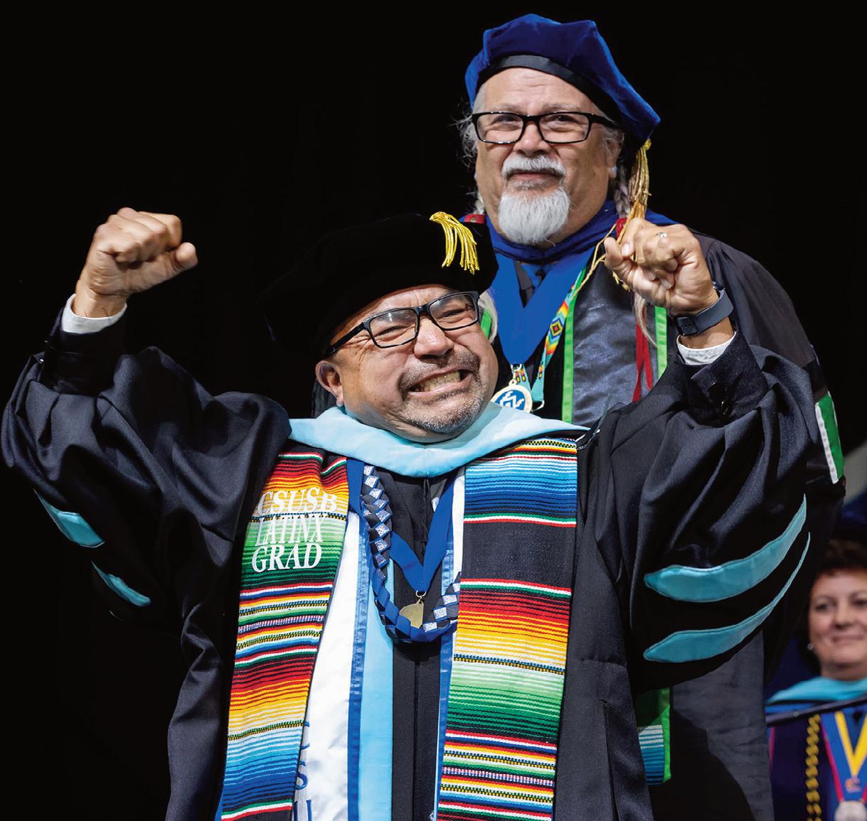 Juan C Luna celebrates after formally receiving his doctoral hood in educational leadership from Enrique Murillo Jr., director of the Doctorate in Educational Leadership program.