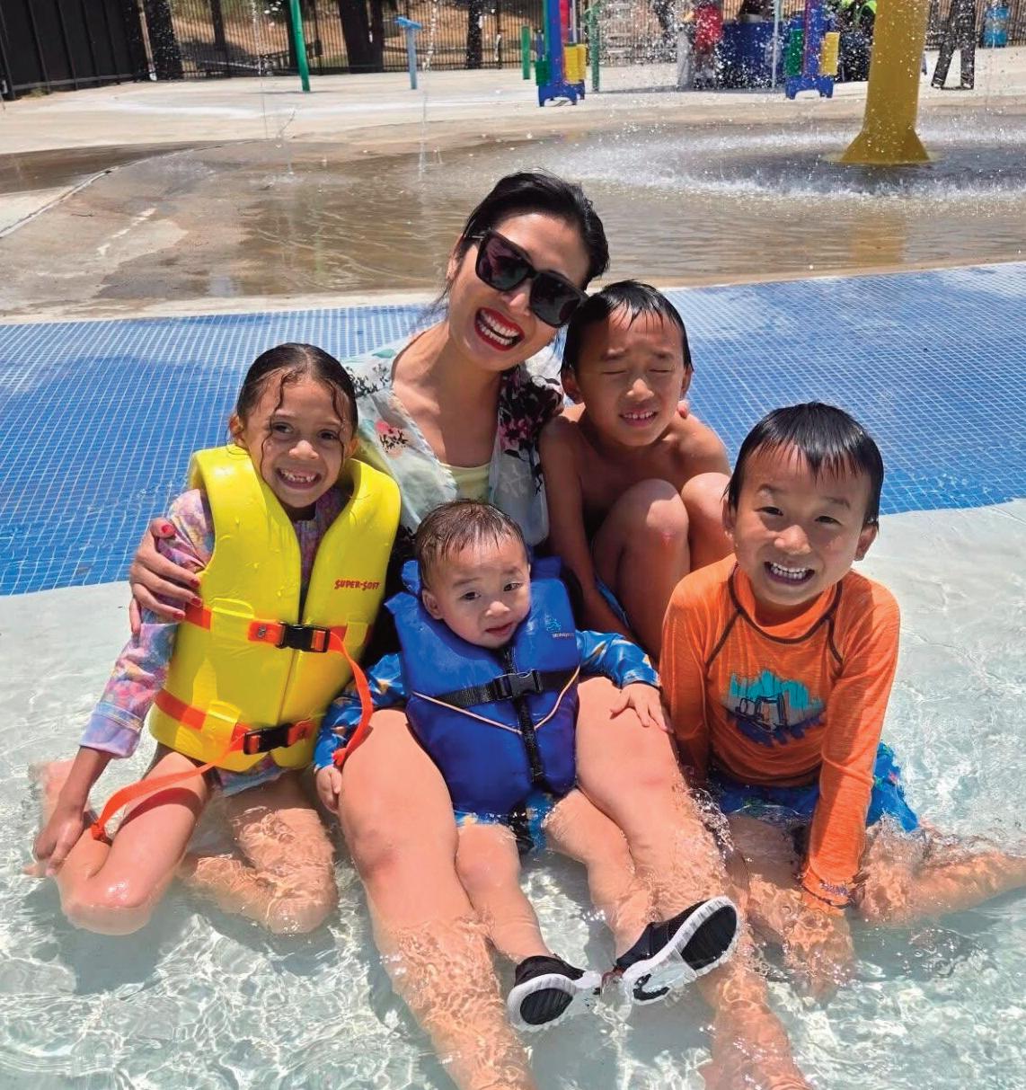 Mayor Helen Tran with her children and family enjoying the Jerry Lewis Swim Center’s splash pad in June 2025.