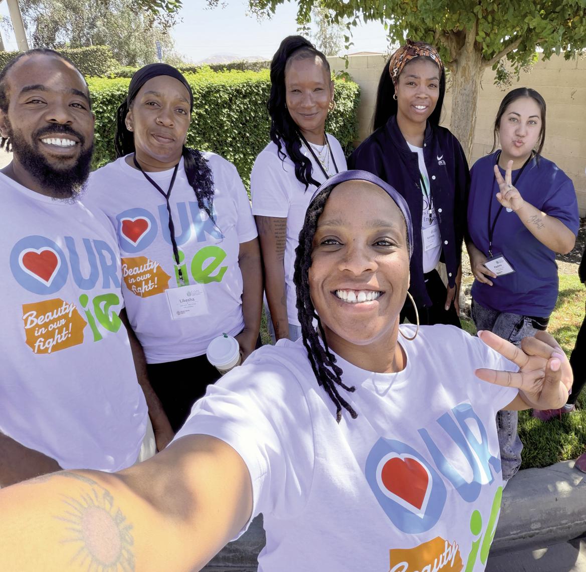 COPE staff and volunteers wearing “Our IE – Beauty in Our Fight” shirts pose for a selfie during door-to-door canvassing in San Bernardino in October 2025.