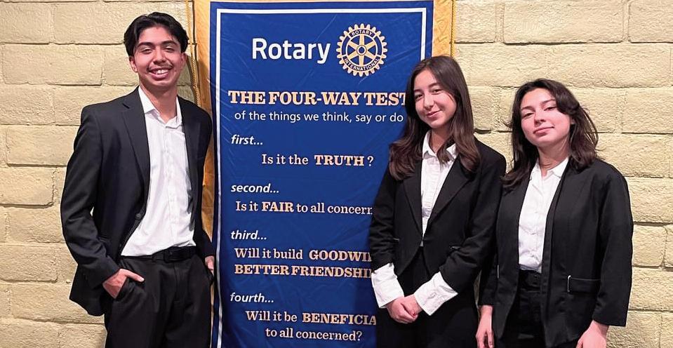 articulating the Rotary’s Four-Way Test principles of truth, fairness, goodwill, and benefit to all The Rotary Club extends its congratulations to all contestants for their commitment and intellectual depth, with special accolades for the winners: Andrew Diaz, who took first place and will progress t o t h e d i s t r i c t c o m p e t i t i o n ; D i a n n a Ruvalcaba, the second-place winner; and Genesis Rodela, who secured third place