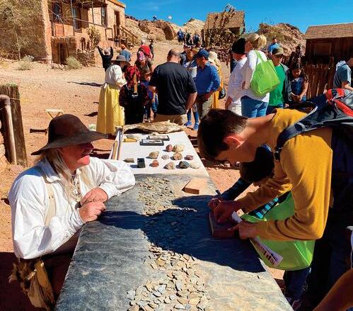 A young man learns how to make an arrowhead from rock chips at California Days at Calico Ghost Town in Yermo, Calif