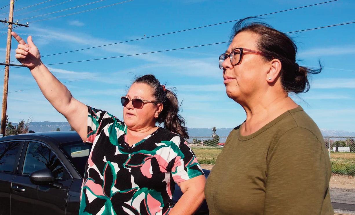 Gov. candidate and former CA Controller Betty Yee talks with Bloomington resident Xochitl Pedraza in front of the demolished Stallion Lane neighborhood, Zimmerman Elementary School, Bloomington Commerce Center, and horse riding lot in Bloomington on Feb. 26, 2026.