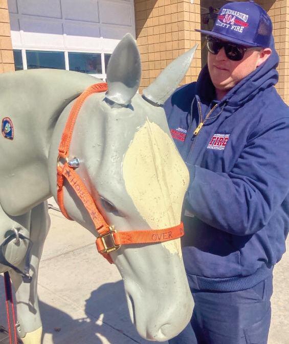 San Bernardino County Firefighter Jerkins learning how to harness a horse