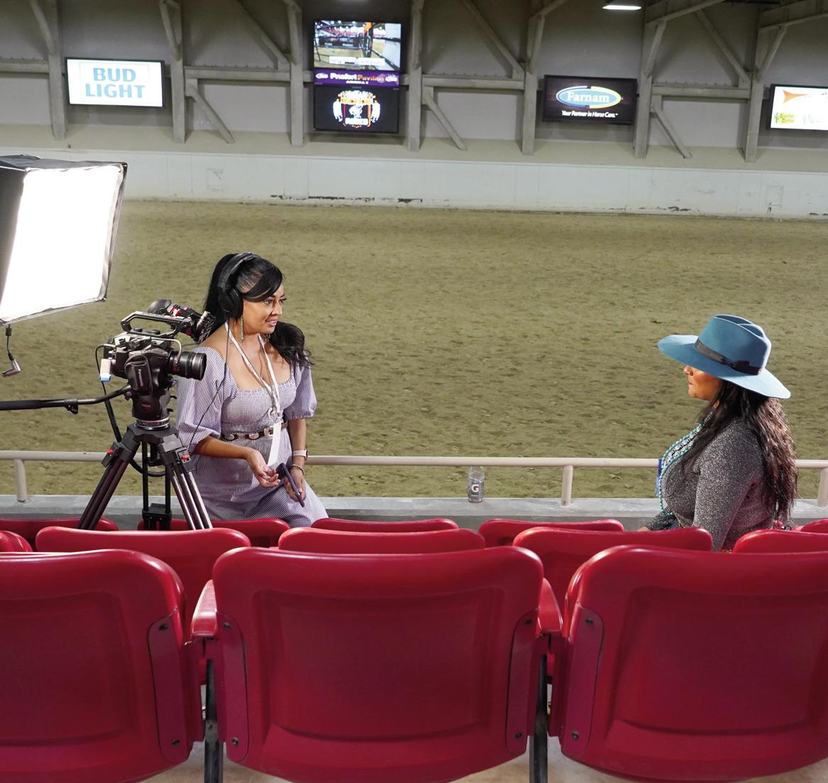 Shayla Sahar interviewing a contestant at the Indian National Finals Rodeo at the South Point Equestrian Center in Las Vegas, Nevada in October 2022.