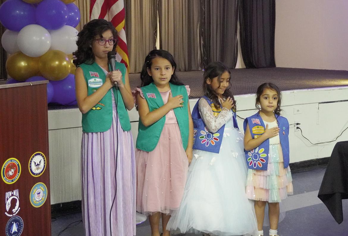 PHOTO DENISE BERVER Girl Scouts Contestants leading the Pledge of Allegiance.