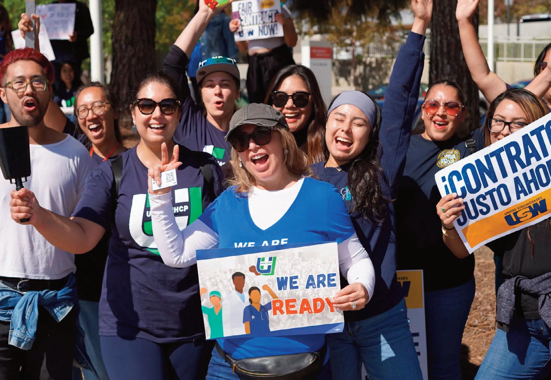 Registered nurse Celina Zumaya (center) joins fellow Kaiser Permanente Fontana workers in a spirited show of unity during day two of the statewide healthcare strike.