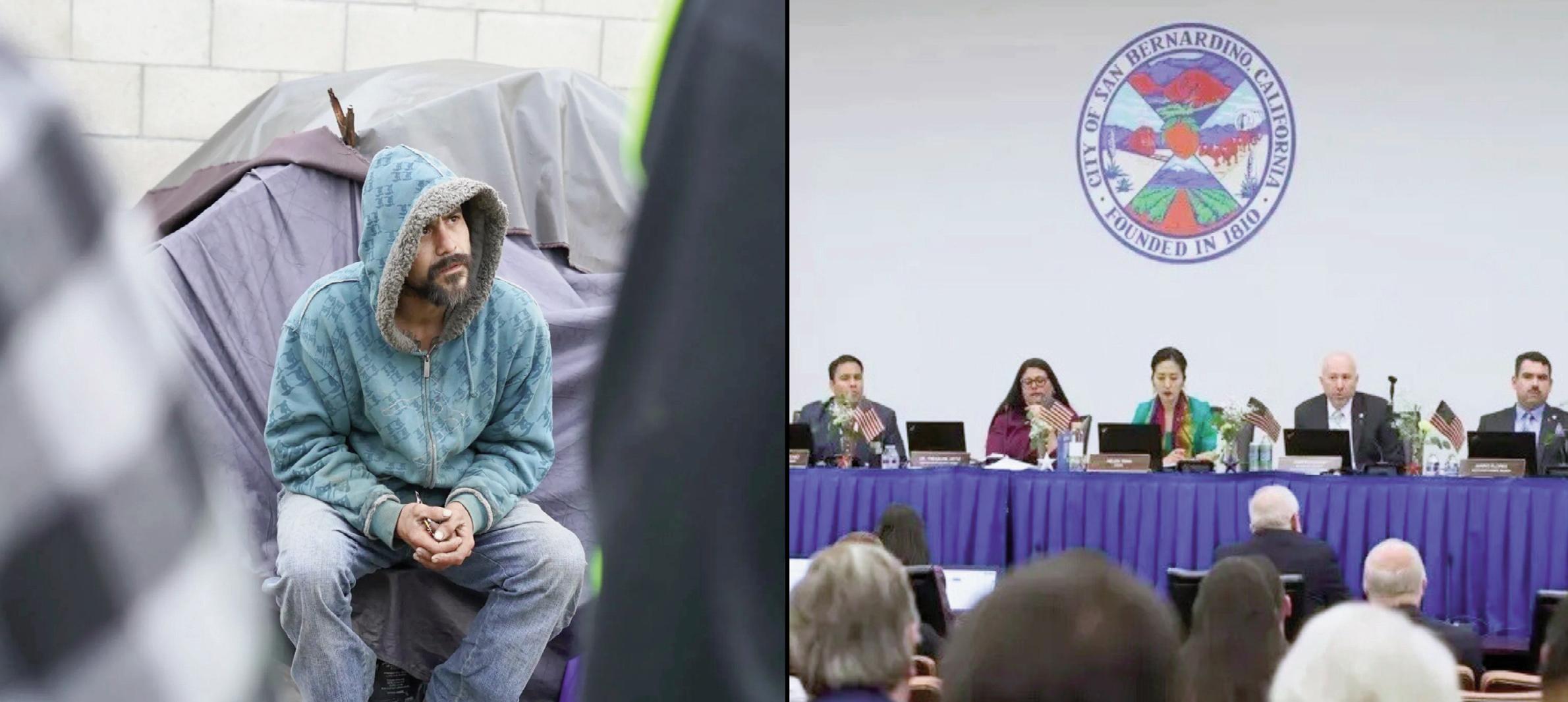 PHOTOS MANNY SANDOVAL (Left) An unsheltered man sits beside a tent during San Bernardino County’s point-in-time count; (right) the San Bernardino City Council meets Jan. 15 to review plans and costs for the 200-bed SB HOPE Campus Navigation Center.