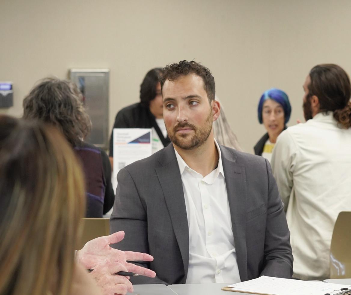 Alejandro Gutierrez Chavez, executive director of Arts Connection, listens as attendees share feedback during a breakout discussion at the Creative Economies in Action town hall.