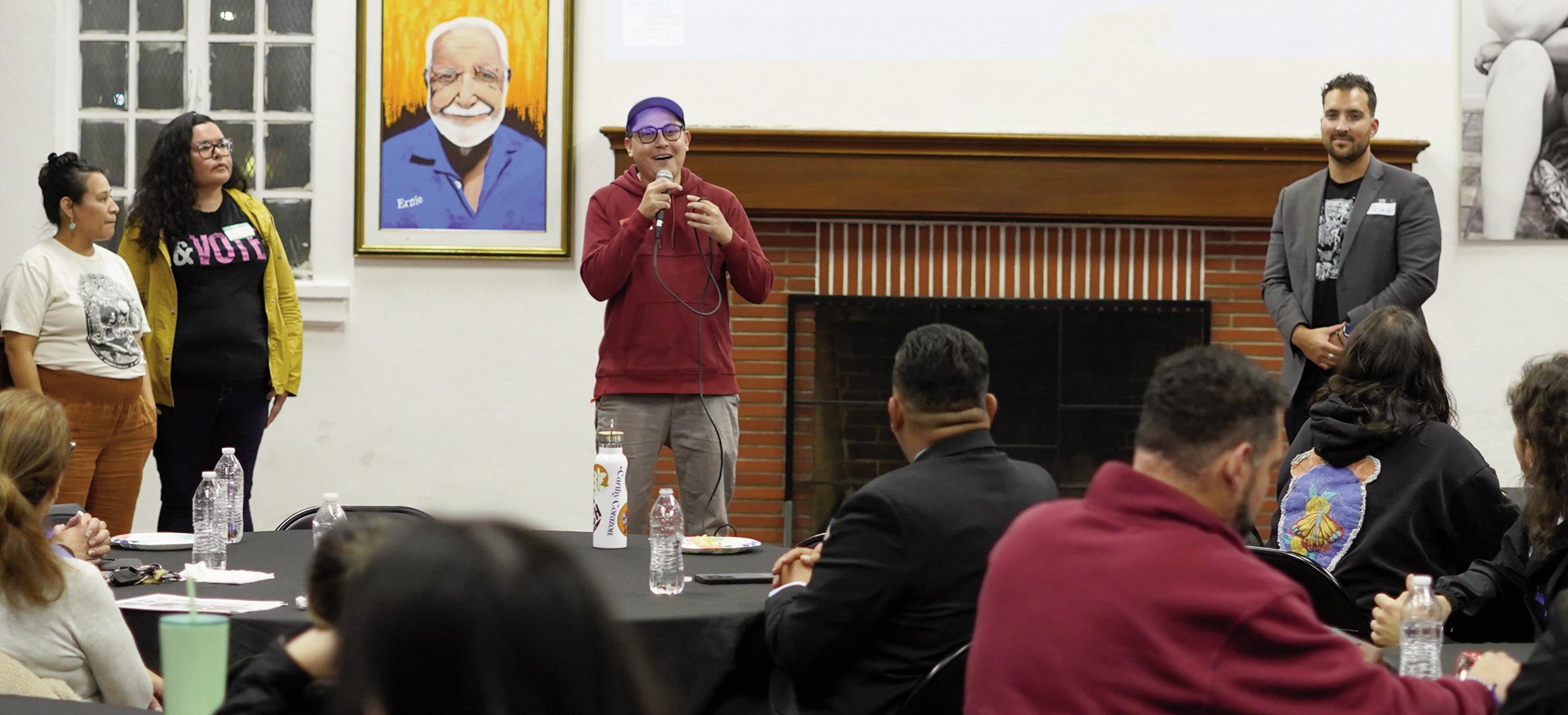 Michael Segura, executive director of the Garcia Center for the Arts, speaks during the San Bernardino Arts Advocacy Gathering on Feb. 12 at the Garcia Center for the Arts, flanked by SB Generation Now Community Organizer Miriam Nieto, far left, and Arts Connection Executive Director Alejandro Gutierrez Chavez, far right.
