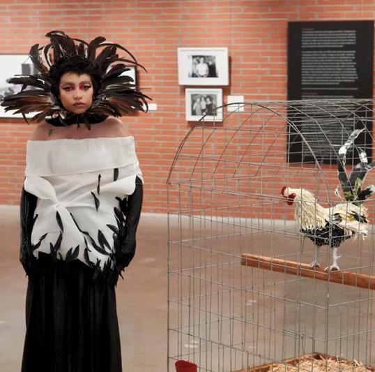 Artist Yulissa Mendoza stands beside their Muscoy-based rooster installation at The Cheech, built from childhood photographs to document how the logistics industry is negatively reshaping their community.