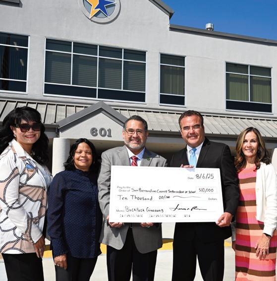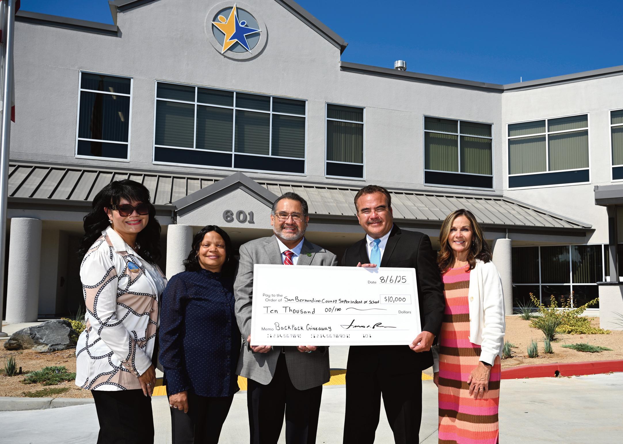 Assemblymember James C. Ramos presents a $10,000 check to San Bernardino County Superintendent of Schools to support a backpack giveaway for more than 1,500 students.