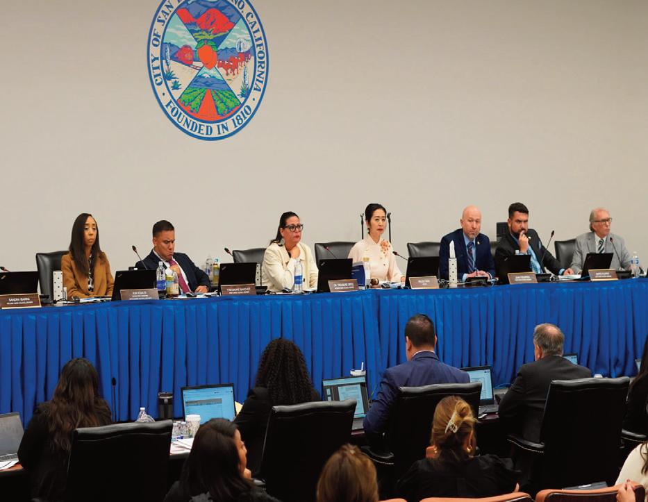PHOTO MANNY SANDOVAL San Bernardino City Council listening to public comment on Feb. 18, 2026. From left: Councilwoman Sandra Ibarra, Mayor Pro Tem Kim Knaus, Councilman Theodore Sanchez, Councilwoman Treasure Ortiz, Mayor Helen Tran, Councilman Juan Figueroa, Mario Flores, and Fred Shorett.