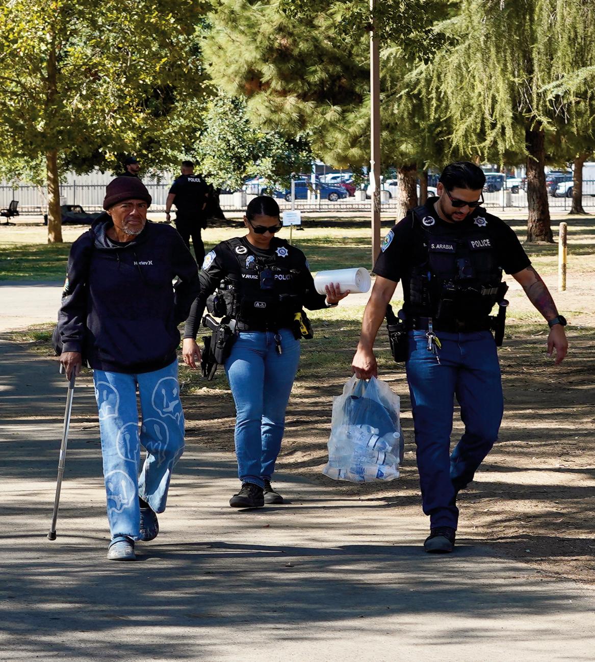 PHOTO MANNY SANDOVAL SBPD helping a homeless man walk his belongings to an on-site vending social service booth.
