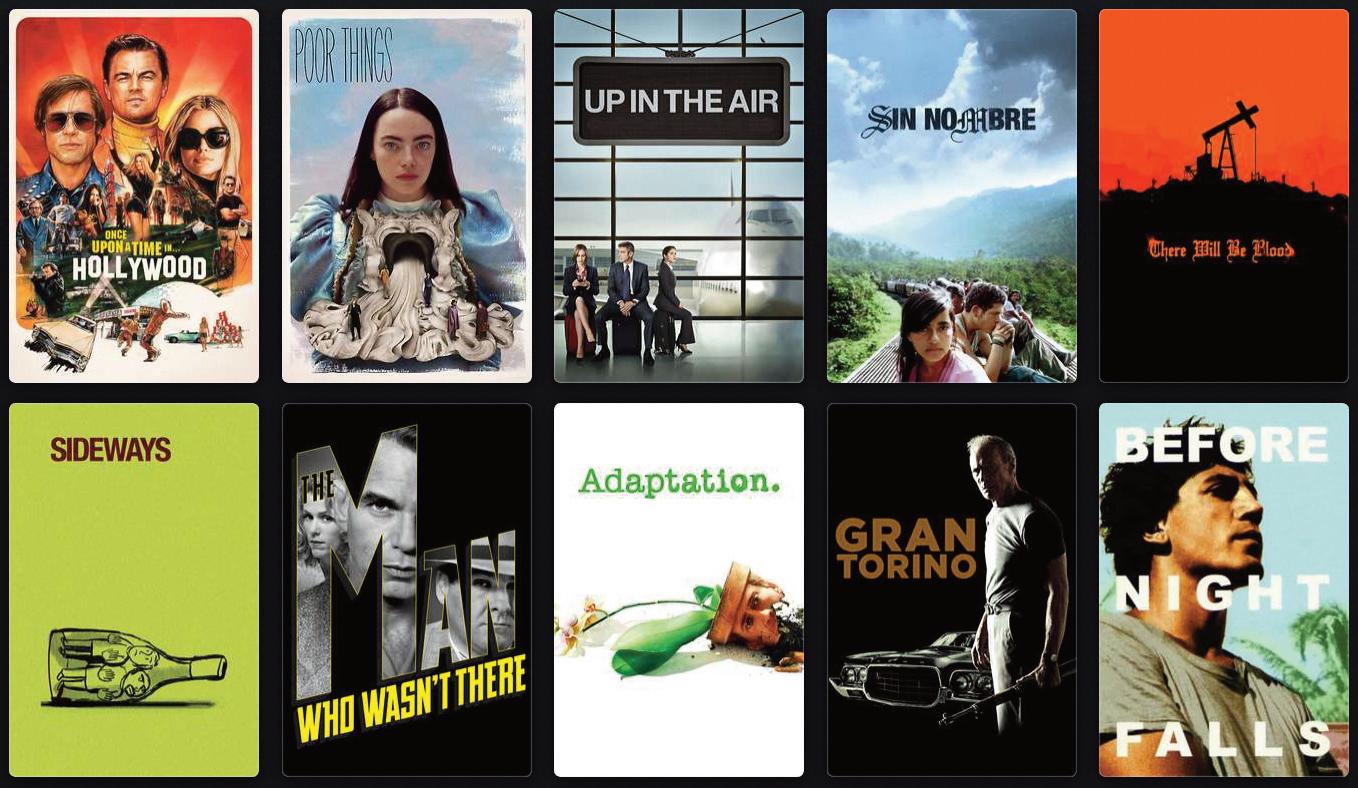 Once Upon a Time... in Hollywood 1 Poor Things 2 Up in the Air 3 Sin Nombre 4 There Will Be Blood 5 Sideways 6 The Man Who Wasn't There 7 Adaptation. 8 Gran Torino 9 Before Night Falls 10 Traffic 11 Almost Famous 12 Y Tu Mamá También 13 Her 14 Donnie Darko 15 The Royal Tenenbaums 16 Memento 17 The Visitor 18 Gangs of New York 19 Far from Heaven 20 Igby Goes Down 21 Mystic River 22 Seabiscuit 23 The Cooler 24 American Splendor 25
