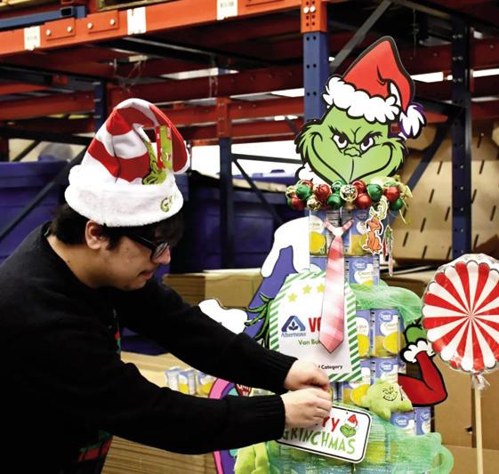 A volunteer adds finishing touches to a Grinch-themed can tree made from donated canned goods at Feeding America Riverside | San Bernardino’s warehouse.